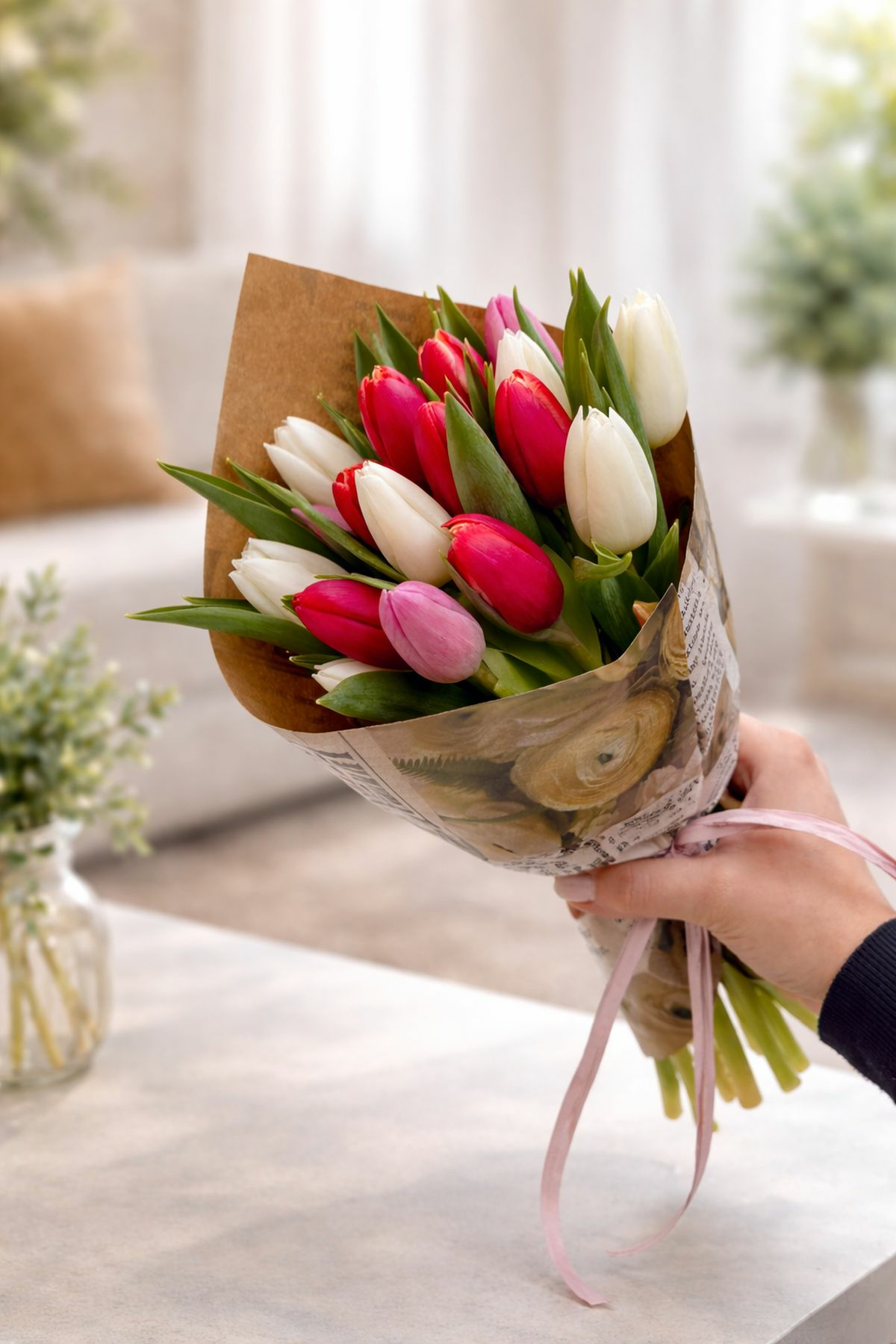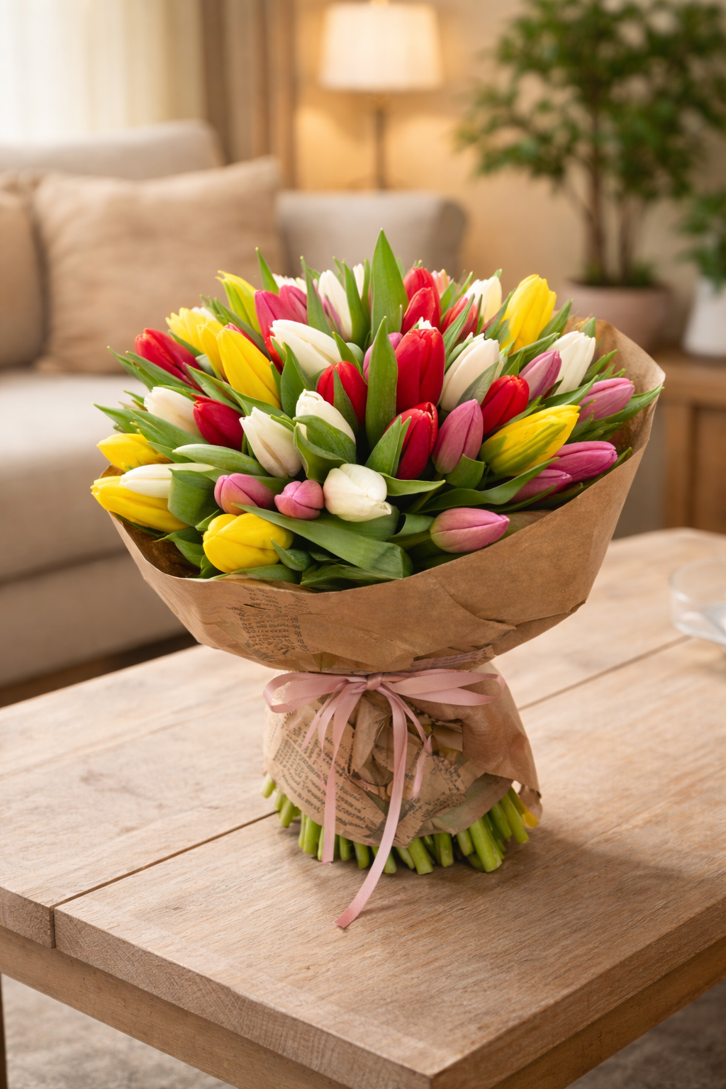 Nuestros floristas elaboran cada ramo de forma artesanal ✂️, cuidando la armonía entre los colores y respetando la forma natural de cada tulipán. Además, lo presentamos envuelto en papel kraft y cinta, aportando un acabado elegante y acogedor.