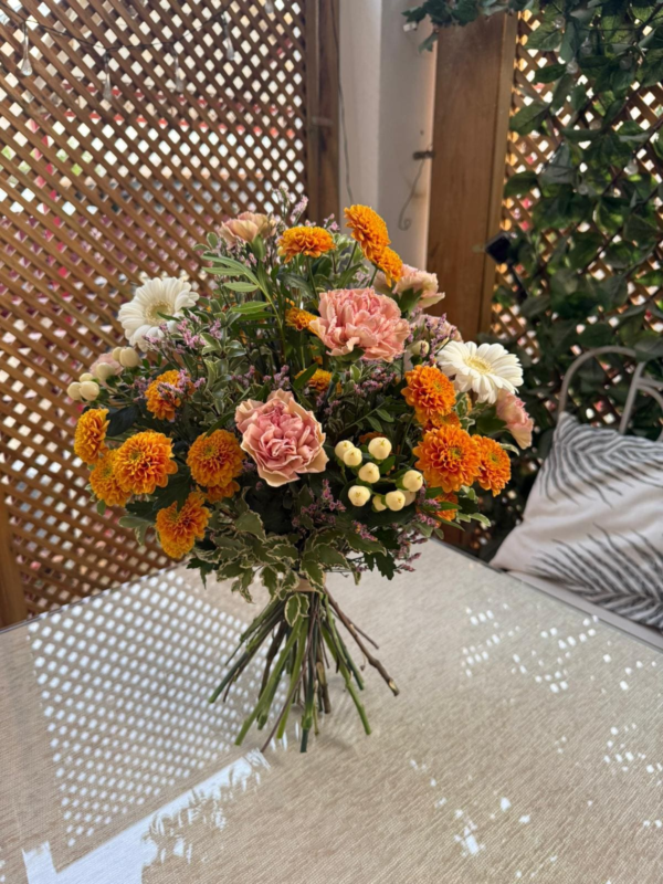 El Ramo Mandarina Soulgarden combina flores que aportan presencia, volumen y un toque vibrante sin perder la elegancia. Las margaritas naranjas son el centro visual del diseño, llenas de energía y color, mientras que los claveles crema suavizan el conjunto aportando equilibrio. El hipericum blanco añade detalle y luminosidad, y el limonium rosa envuelve el ramo con un toque delicado. Las gerberas blancas aportan estructura y presencia, haciendo que el ramo mantenga una composición atractiva y muy decorativa. 🤍🌸