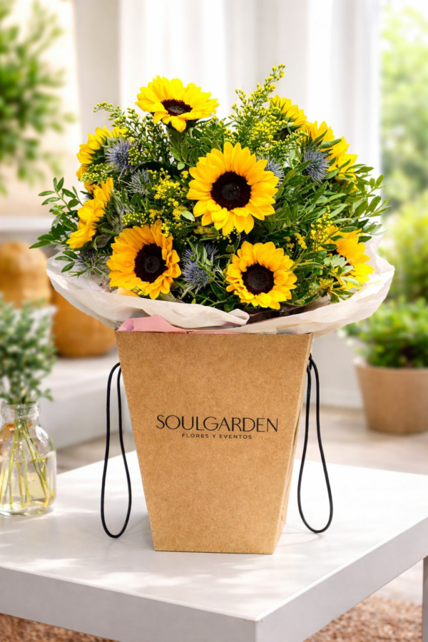 El protagonista absoluto es el girasol, con su color dorado vibrante y su forma que sigue la luz. Le acompañan otras flores y verdes cuidadosamente seleccionados para realzar su belleza: